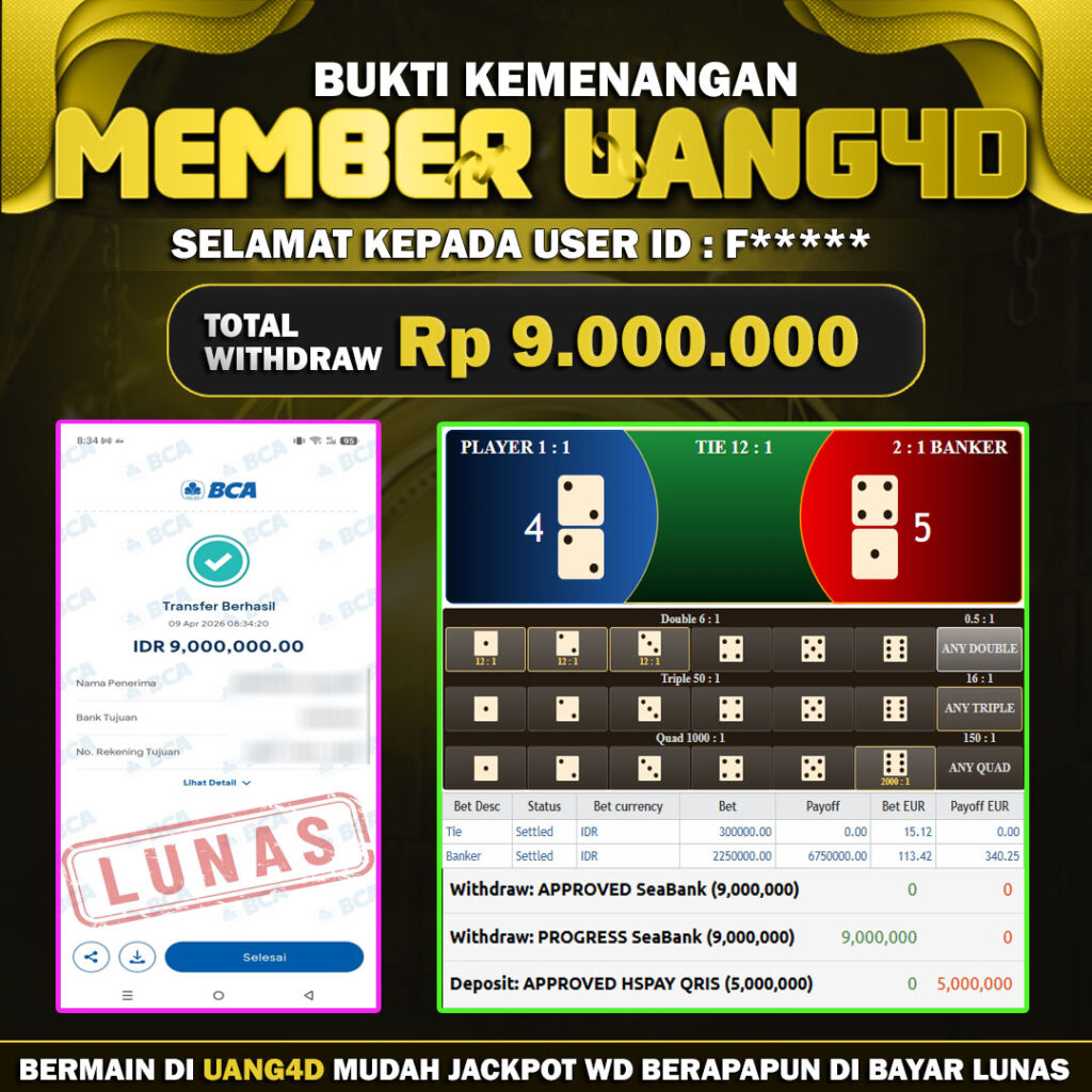 Setiap hari, member UANG4D berhasil meraih jackpot besar dari berbagai macam permainan livecasino ternama yang kami sediakan, seperti Roullete, Dragon & Tiger, Qiu Qiu dan masih banyak lagi. Kami secara rutin menampilkan bukti screenshot atau rekapan kemenangan yang berhasil diraih, mulai dari kemenangan ratusan ribu hingga puluhan juta rupiah. Semua slip kemenangan ini kami hadirkan untuk membuktikan bahwa di UANG4D, peluang menang itu nyata.