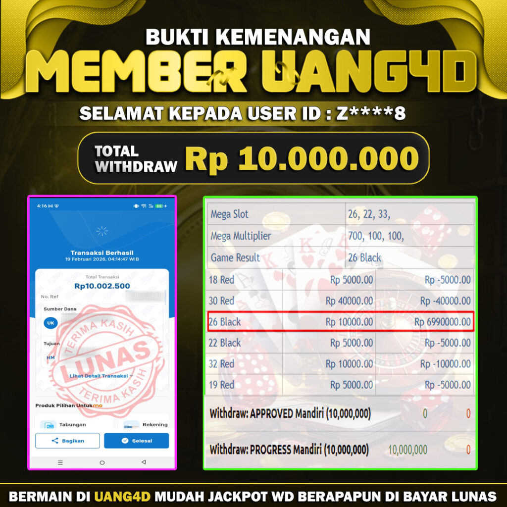 UANG4D dikenal sebagai situs terpercaya yang selalu menghadirkan pengalaman bermain slot online yang aman, fair, dan berlisensi resmi. Di sini, kami tidak hanya sekadar memberikan janji, tapi bukti nyata berupa slip kemenangan yang dapat Anda lihat secara langsung.
