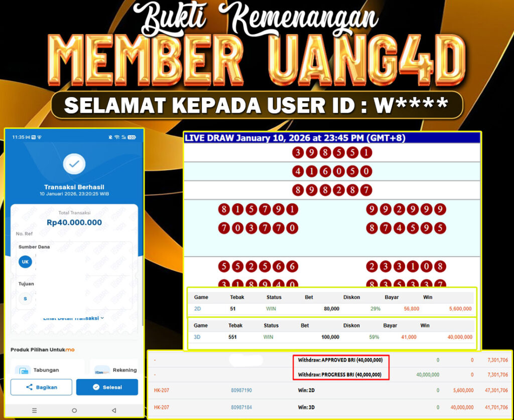 Setiap hari, member UANG4D berhasil meraih jackpot besar dari berbagai provider togel ternama yang kami sediakan, seperti Sydney, Singapore, Hongkong dan masih banyak lagi. Kami secara rutin menampilkan bukti screenshot atau rekapan kemenangan yang berhasil diraih, mulai dari kemenangan ratusan ribu hingga puluhan juta rupiah. Semua slip kemenangan ini kami hadirkan untuk membuktikan bahwa di UANG4D, peluang menang itu nyata.