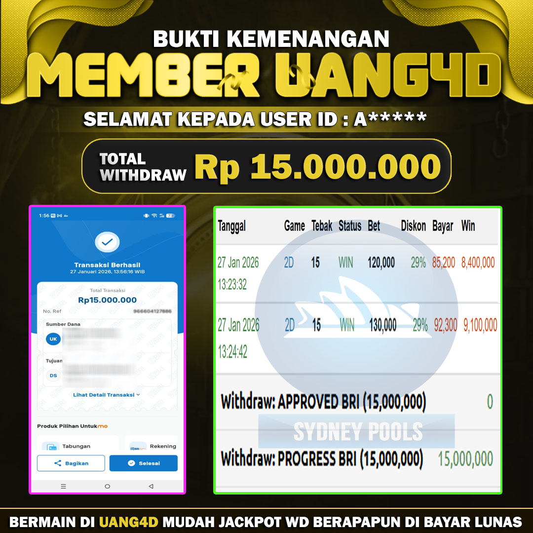 Setiap hari, member UANG4D berhasil meraih jackpot besar dari berbagai provider togel ternama yang kami sediakan, seperti Sydney, Singapore, Hongkong dan masih banyak lagi. Kami secara rutin menampilkan bukti screenshot atau rekapan kemenangan yang berhasil diraih, mulai dari kemenangan ratusan ribu hingga puluhan juta rupiah. Semua slip kemenangan ini kami hadirkan untuk membuktikan bahwa di UANG4D, peluang menang itu nyata.